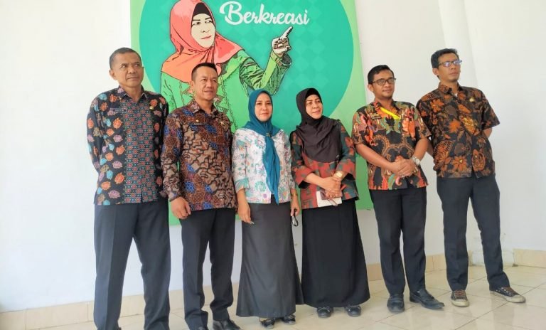 Fauziah A Rachman (tiga dari kanan) bersama para Kabid berfoto bersama di depan baliho motto dinasnya. FOTO: Istimewa